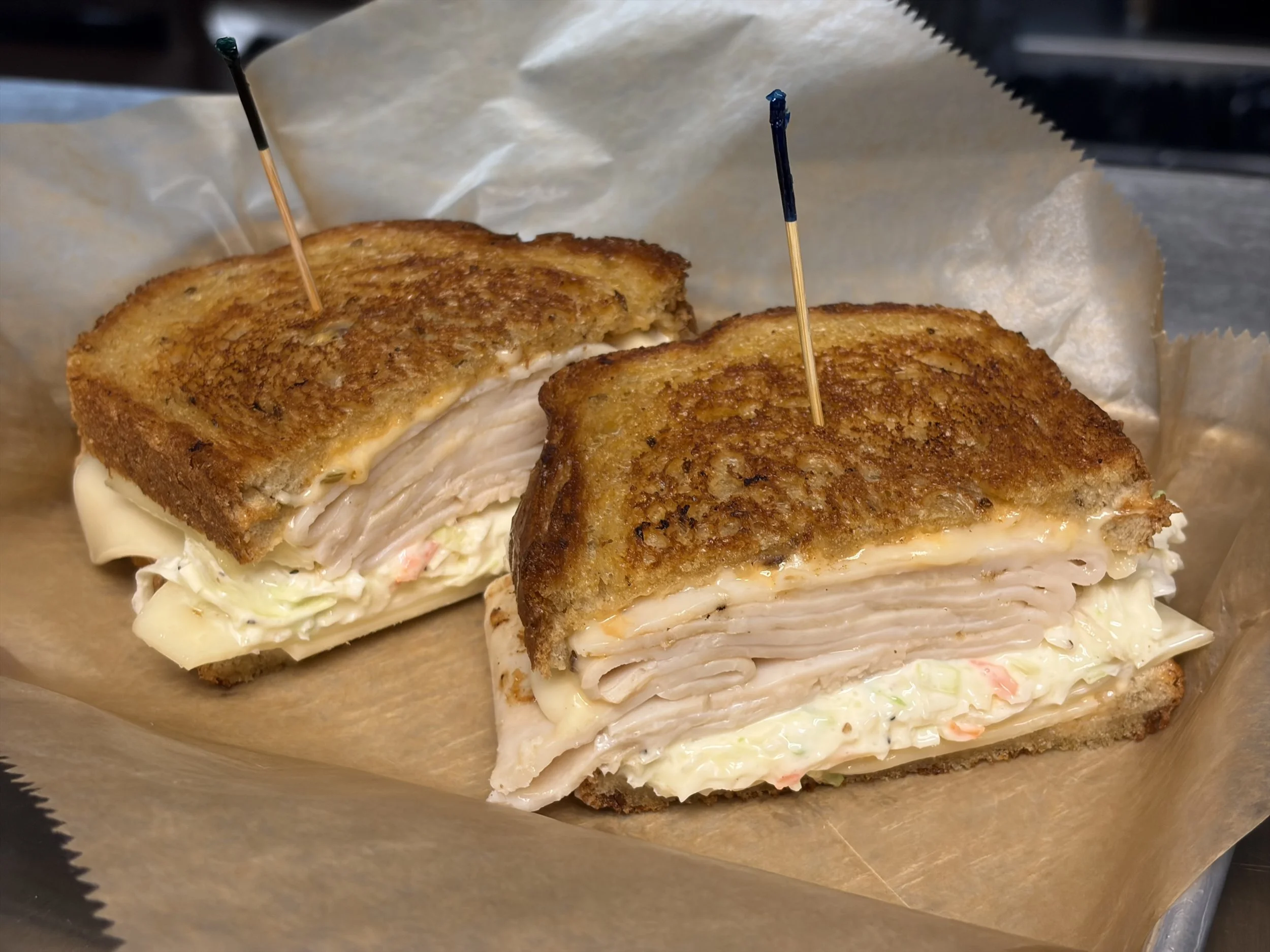 Turkey reuben with coleslaw.